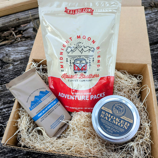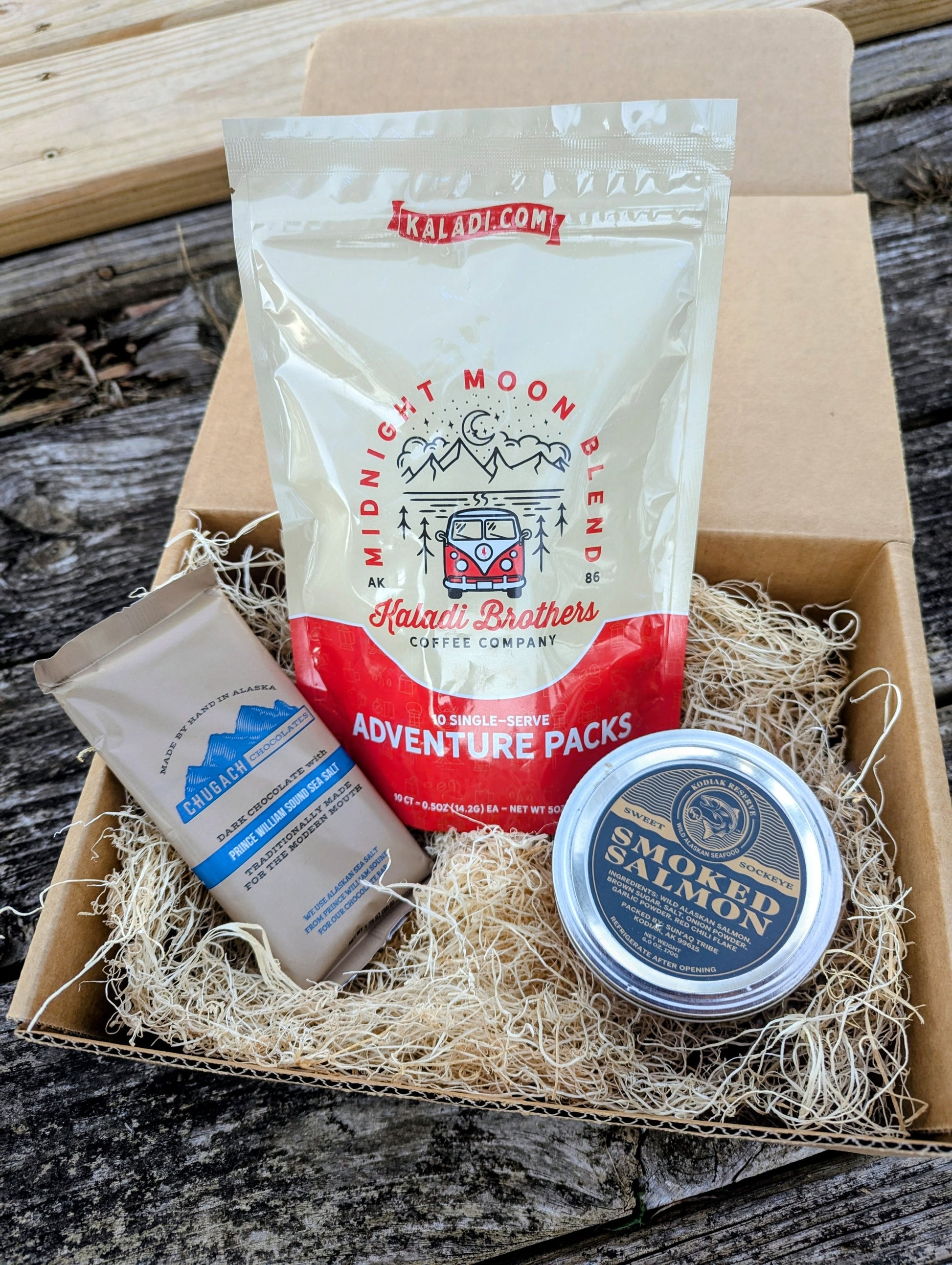 A curated collection of our favorite morning on-the-go goodies from Alaska. Includes one premium grade smoked sockeye salmon jar (6 oz.), one Chugach dark chocolate bar with Prince William Sound sea salt (1.75 oz.), and 10 Kaladi Brothers single-serve adventure coffee packs (5 oz.). For the perfect cup of coffee with sweet and savory snacks anywhere anytime!